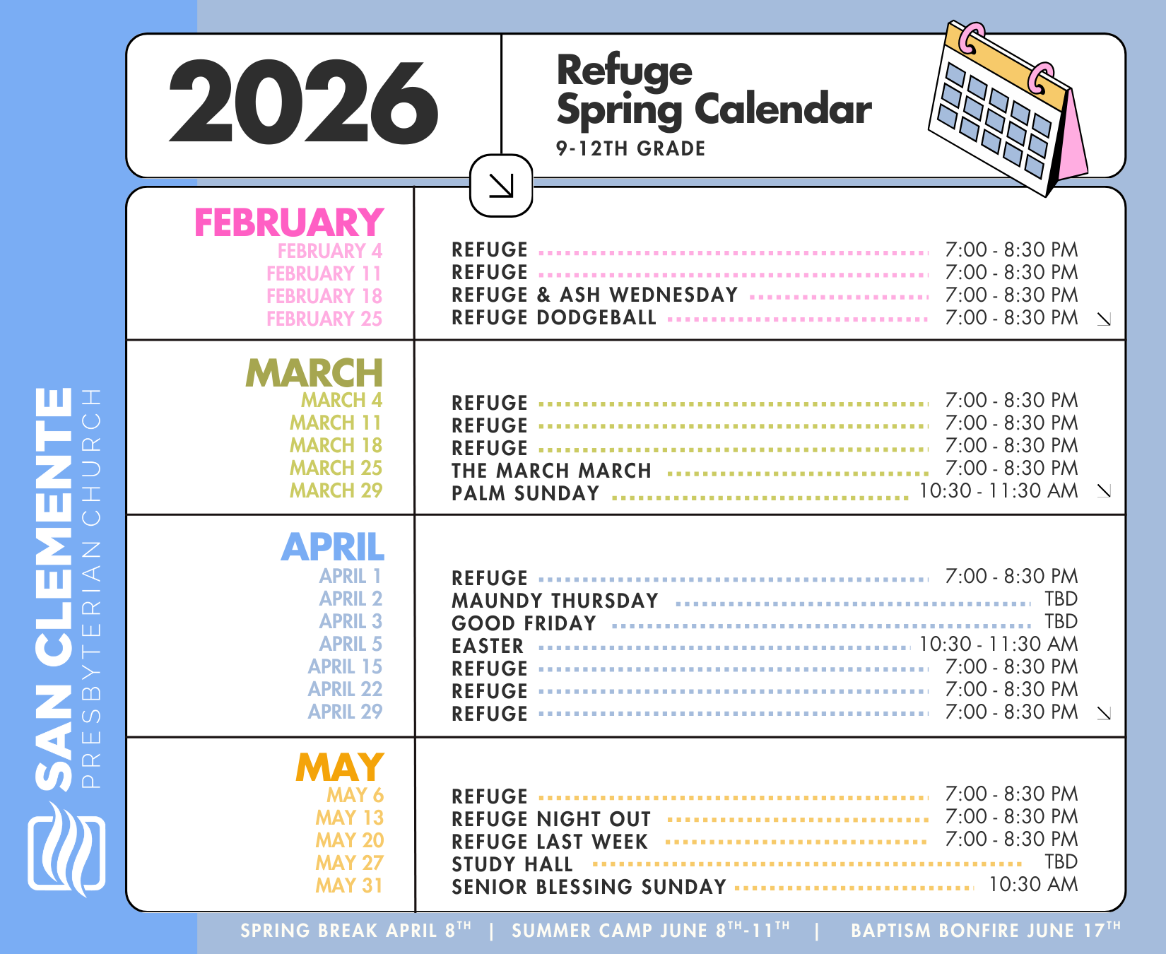 Take a moment to download the calendars below and save them to your phone or family calendar so you don’t miss a thing. We’re excited for all God has in store this spring!